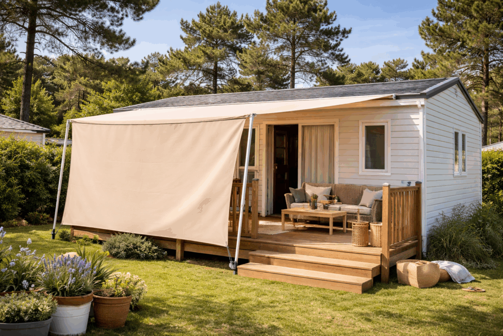 Installer une bâche à l’avant du mobil-home revient, dans les faits, à créer une extension. Sans dalle, sans permis complexe, sans gros chantier.